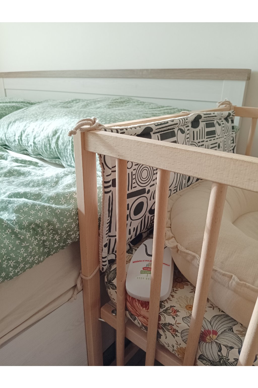 A soft, double-sided crib accessory designed to support visual and sensory development during the earliest months.
